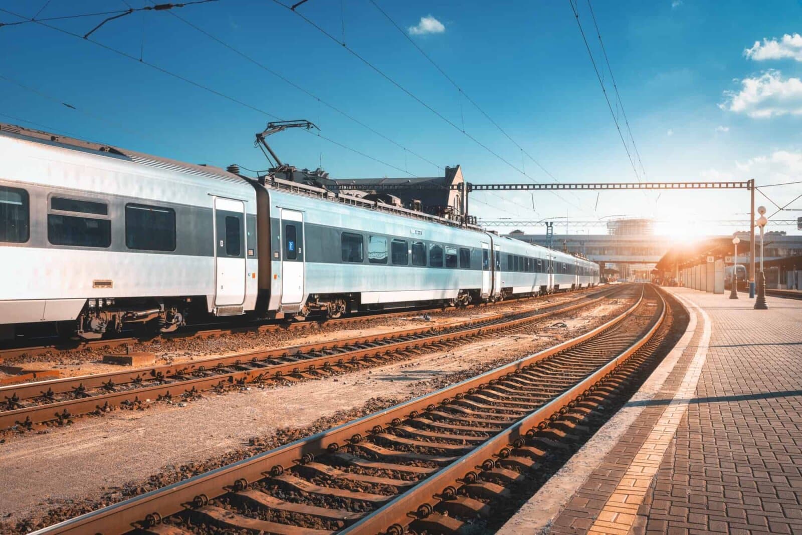 Beautiful passenger train at the railway station at sunset. Industrial view with modern intercity train, railroad, railway platform and blue sky in the evening. Railway tourism and transportation